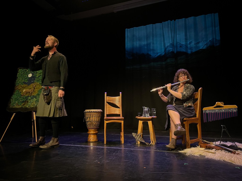 ‘Ancient Celtic stories filled with druids, shapeshifters, sacred deer and warriors emerge. Rae’s animated score aptly enhances and punctuates Mackay’s delivery with sound effects and heartfelt melodies.’